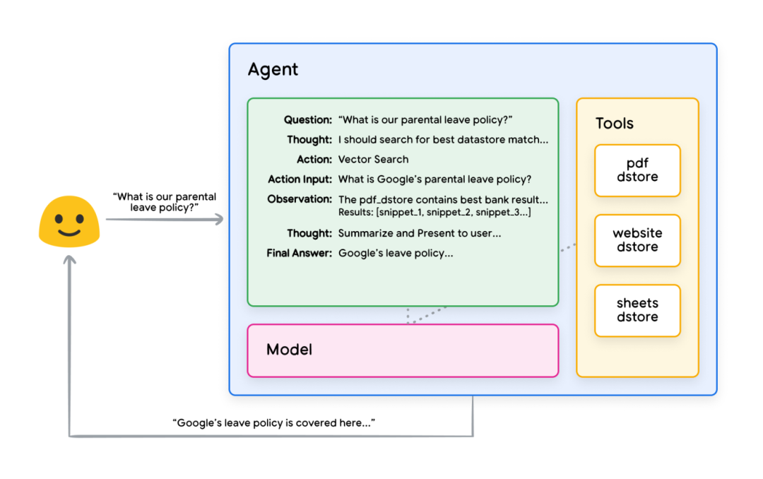 截至本白皮书发布之日,Google 模型能够交互的主要工具类型有三种:Extensions(扩展)、Functions(函数) 和 Data Stores(数据存储)。通过为智能体配备工具,我们可以释放其潜力,使其不仅能理解世界,还能对其采取行动,从而为各种新应用和可能性打开大门。