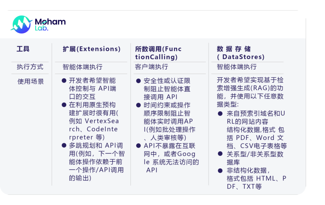 扩展(Extensions)、函数(Functions)和数据存储(Data Stores)构成了智能体在运行时可用的几种工具类型。每种工具都有其特定的用途,开发者可以根据具体需求选择单独使用或组合使用这些工具。