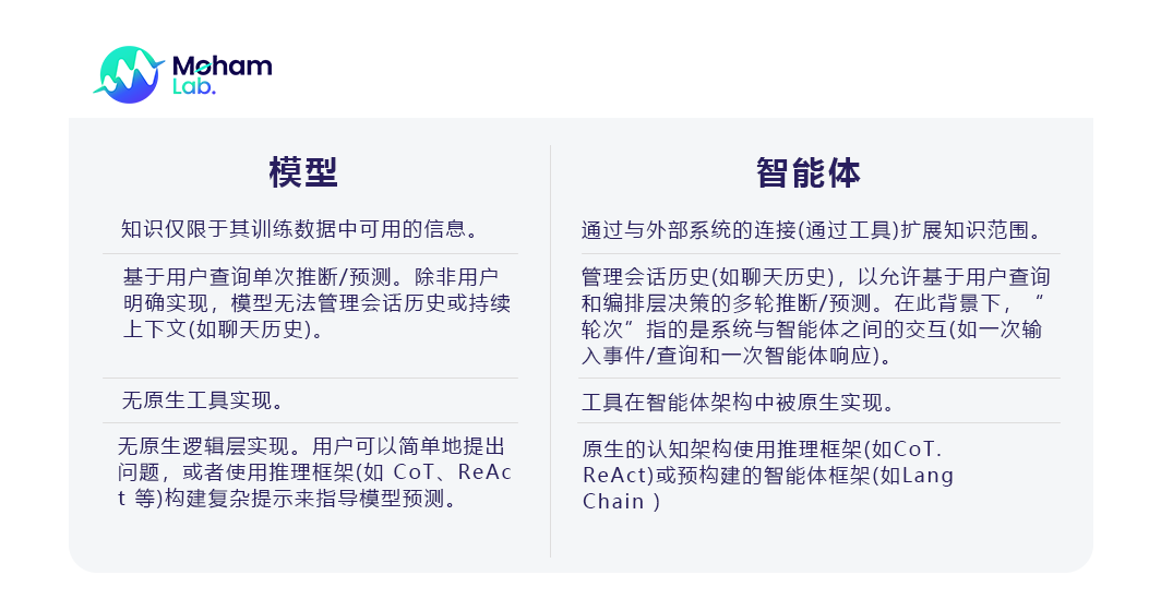 为了更清楚地理解智能体与模型之间的区别,请参考以下对比表: