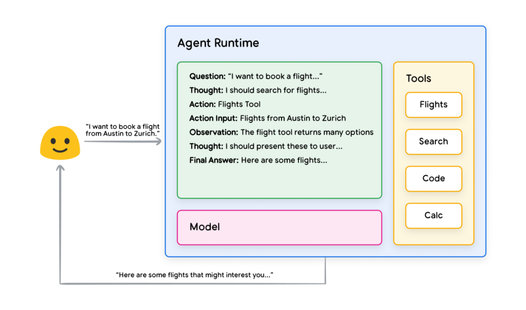 通过这种方式,模型、工具和智能体配置协同工作,根据用户的原始查询提供有依据且简洁的响应。尽管模型可能基于其已有知识猜测答案(即产生幻觉),但它通过使用工具(如 Flights)搜索实时外部信息,获取了额外的信息,从而基于真实的事实数据做出更明智的决策并将此信息总结反馈给用户。