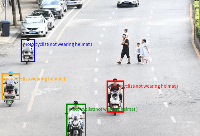 输入4:Detect all motorcyclists in the image and return their locations in the form of coordinates. The format of output should be like {“bbox_2d”: [x1, y1, x2, y2], “label”: “motorcyclist”, “sub_label”: “wearing helmat” # or “not wearing helmat”}.
