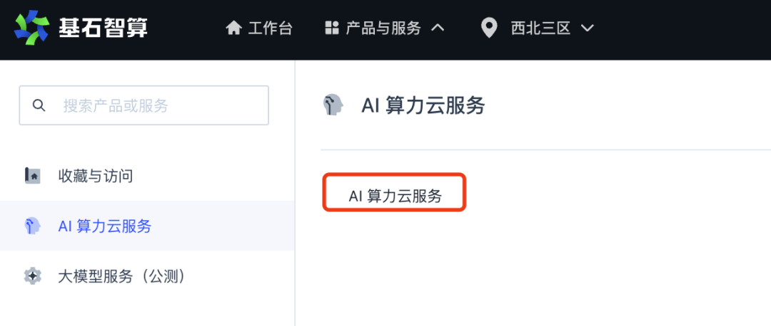 登录基石智算控制台(console.coreshub.cn),在顶部导航栏中,选择“产品与服务” - “AI 算力云服务”。