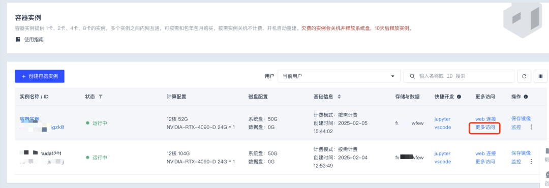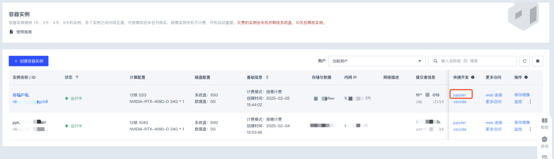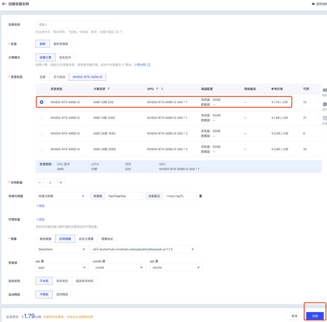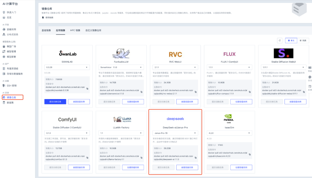 点击“镜像仓库”,选择 DeepSeek 镜像的 Janus-Pro-7B,点击“创建容器实例”,选择单卡 4090,点击创建,预估 1 分钟创建完成,1 分钟启动 WebUI 服务。
