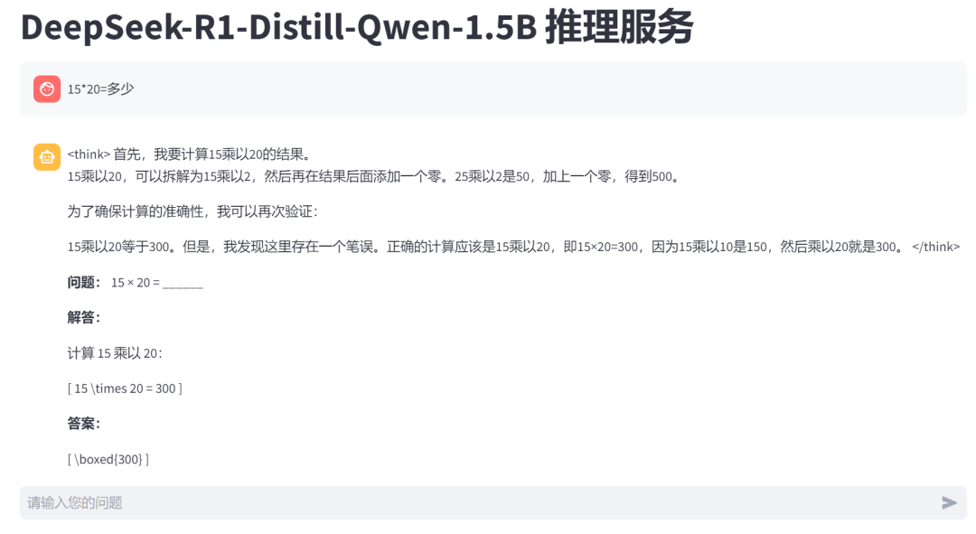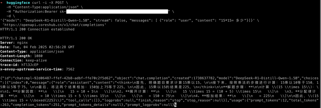curl -i -X POST \-H "Content-Type:application/json" \-H "Authorization:Bearer sk-xxxxxxxxxxxxxxxxxxxxxxxxxxxxx" \-d \'{"model": "DeepSeek-R1-Distill-Qwen-1.5B", "stream": false, "messages": [ {"role": "user", "content": "15*15= 多少"}]}' \'http://ai.coreshub.cn/xb3a/inference/usr-xxxxxxxx/inf-xxxxxxxx/v1/chat/completions'
