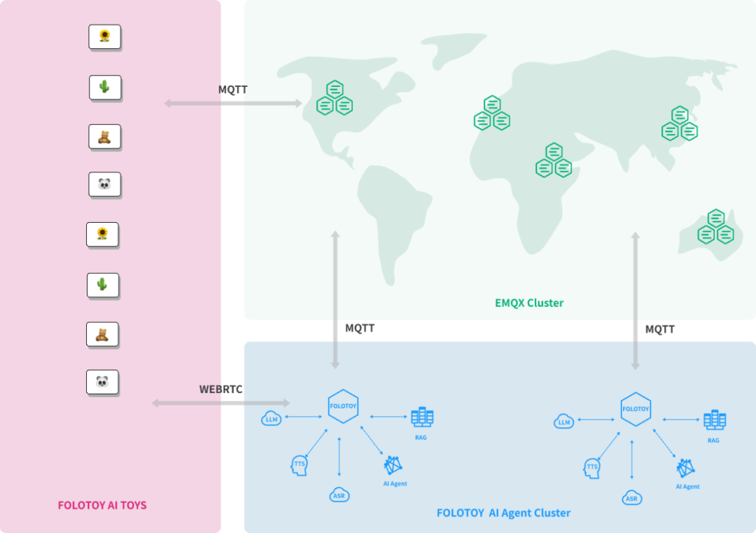 通过 EMQX Platform 的分布式集群架构和负载均衡能力,帮助 FoloToy 应对系统在全球范围内面临的高并发请求和负载压力。依靠多节点分布式集群架构,让系统能够根据设备的连接请求和消息负载动态调整任务分配,避免单点故障导致的服务中断。这种负载均衡和容错能力确保了系统的高可用性和稳定性,即使面对大量并发设备,也能保证顺畅的消息传递和低延迟的互动。