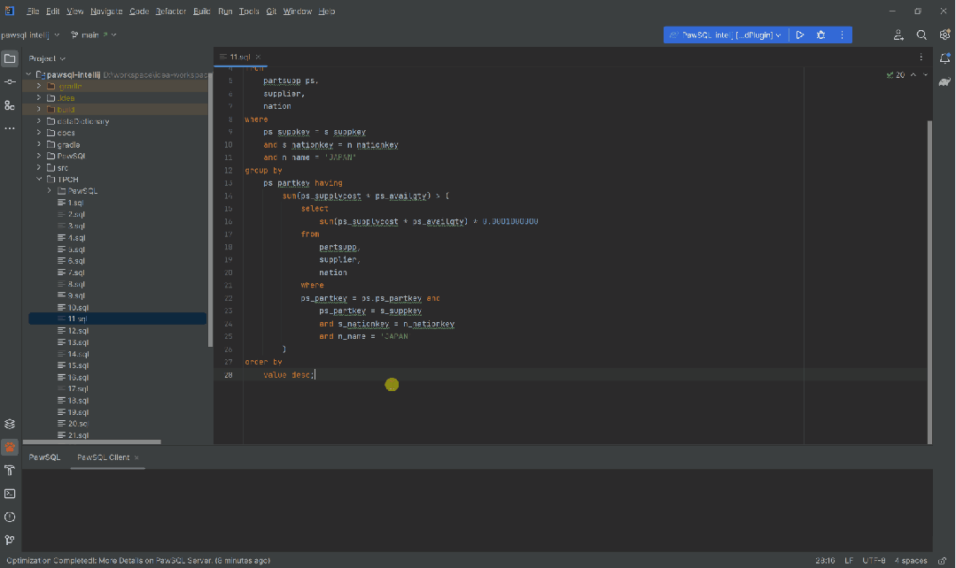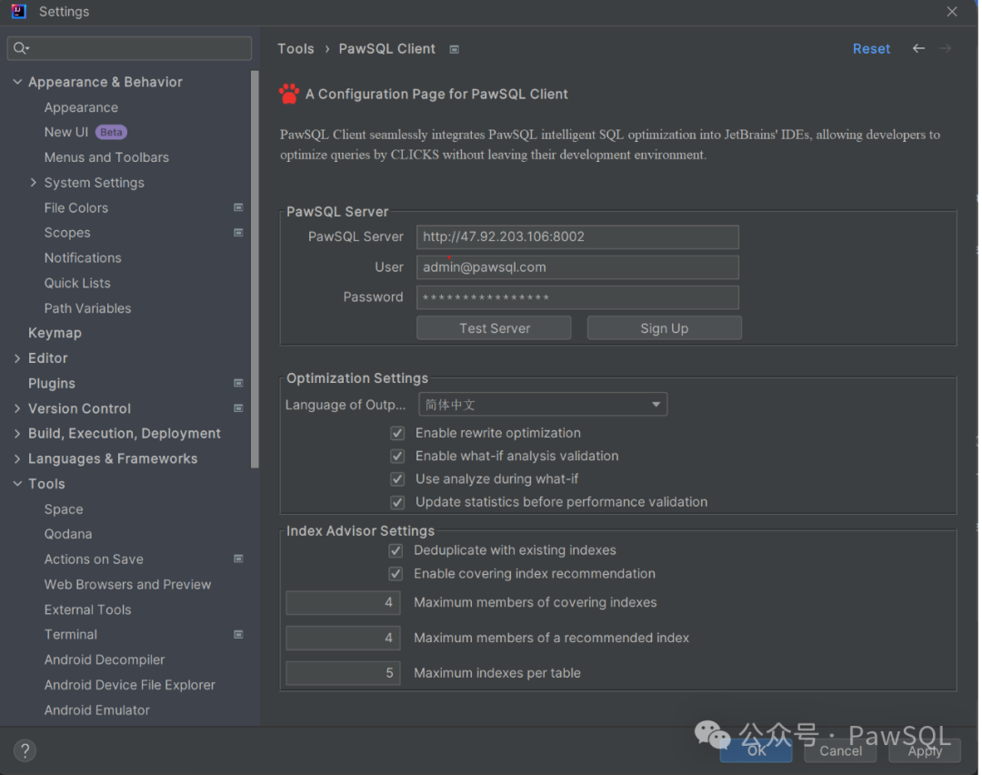 PawSQL for Jetbrains(PawSQL Client) 和 PawSQL for VSCode一样,它将PawSQL引擎的智能 SQL 优化能力无缝集成到您的开发环境中,支持智能索引推荐、查询重写和自动化性能验证。通过与PawSQL Cloud或企业私域部署的PawSQL优化平台配合使用,让开发者在在自己的IDE中完成SQL 性能优化。