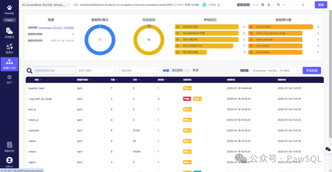 PawSQL支持Oceanbase数据库的慢查询巡检及数据库对象巡检。