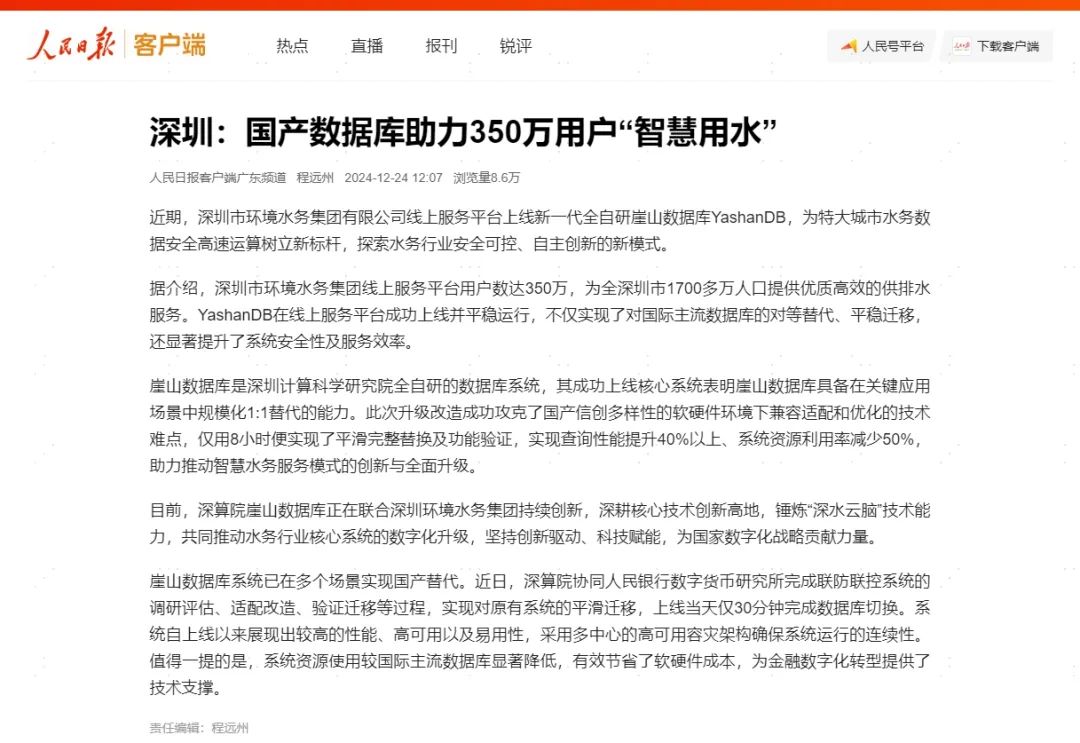 近期,深圳市环境水务集团有限公司线上服务平台上线新一代全自研崖山数据库YashanDB,为特大城市水务数据安全高速运算树立新标杆,探索水务行业安全可控、自主创新的新模式。