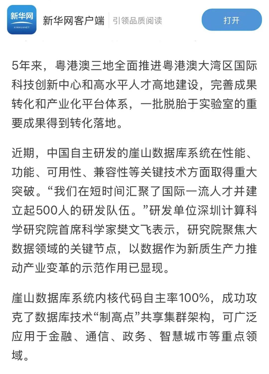 近期,中国自主研发的崖山数据库系统在性能、功能、可用性、兼容性等关键技术方面取得重大突破。“我们在短时间汇聚了国际一流人才并建立起500人的研发队伍。”研发单位深圳计算科学研究院首席科学家樊文飞表示,研究院聚焦大数据领域的关键节点,以数据作为新质生产力推动产业变革的示范作用已显现。