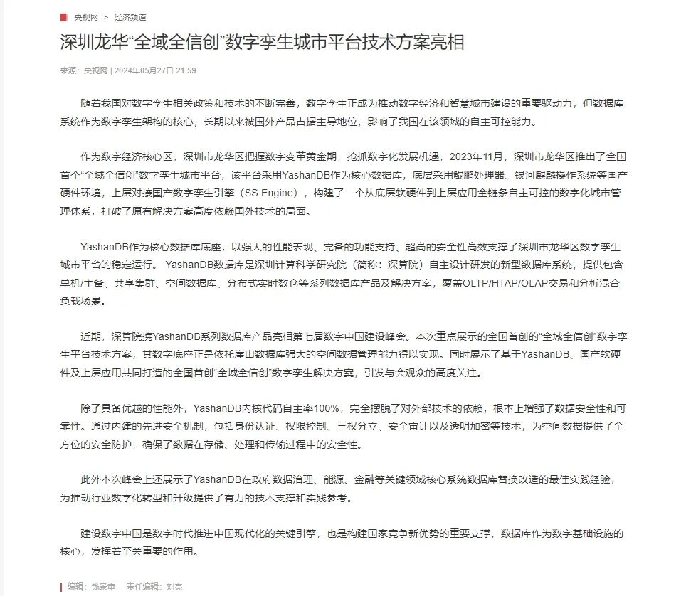 深圳龙华“全域全信创”数字孪生城市平台采用YashanDB作为核心数据库,底层采用鲲鹏处理器、银河麒麟操作系统等国产硬件环境,上层对接国产数字孪生引擎(SS Engine),构建了一个从底层软硬件到上层应用全链条自主可控的数字化城市管理体系,打破了原有解决方案高度依赖国外技术的局面。