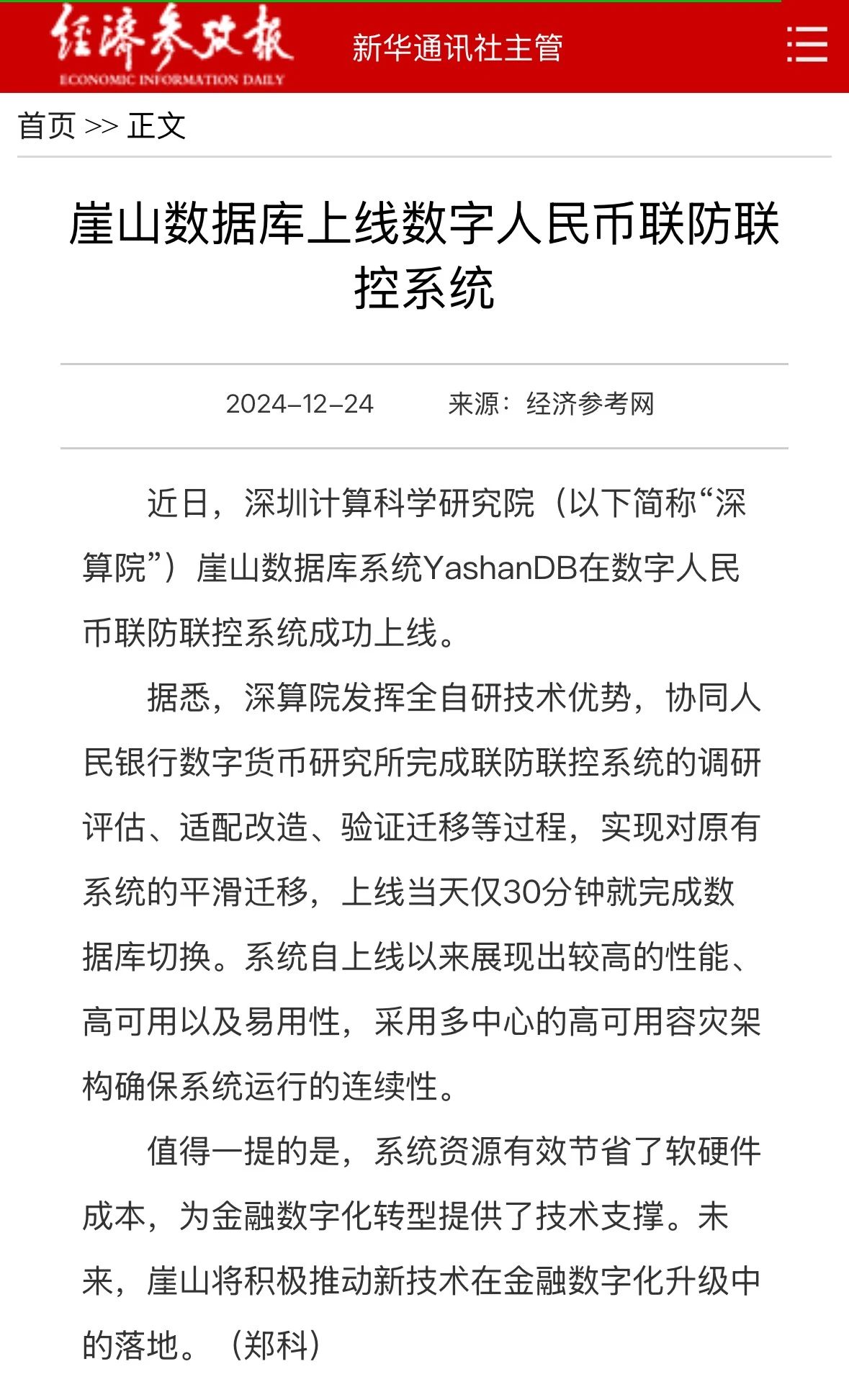 深圳计算科学研究院崖山数据库系统YashanDB在数字人民币联防联控系统成功上线。