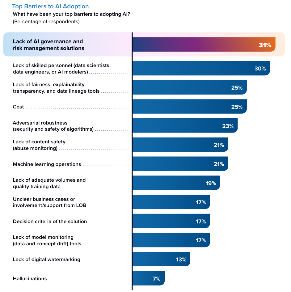 超过 30% 的受访者指出,缺乏治理和风险管理是使用 AI 技术和解锁 AI 技术的最大障碍。