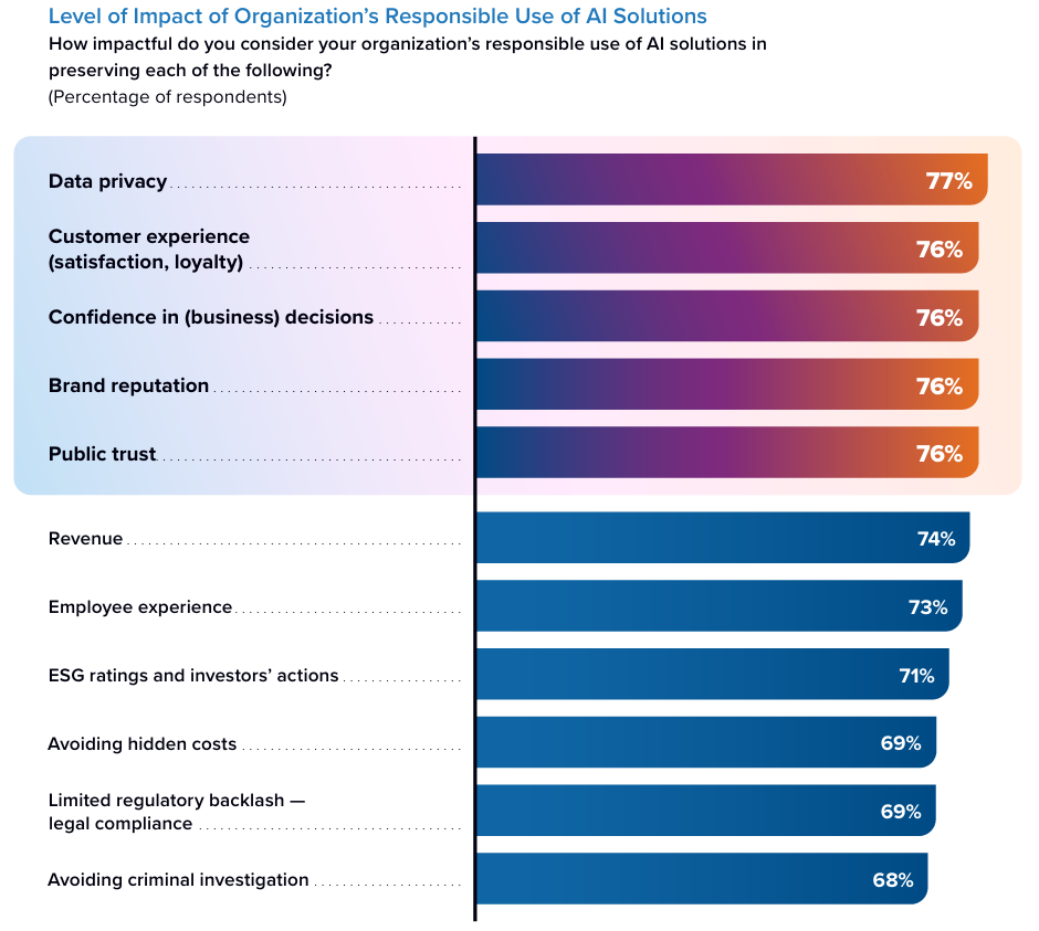 超过 75% 使用负责任 AI 解决方案的受访者指出,负责任 AI 解决方案帮助其在数据隐私、客户体验、业务决策力、品牌声誉和信任方面取得了显著提升。