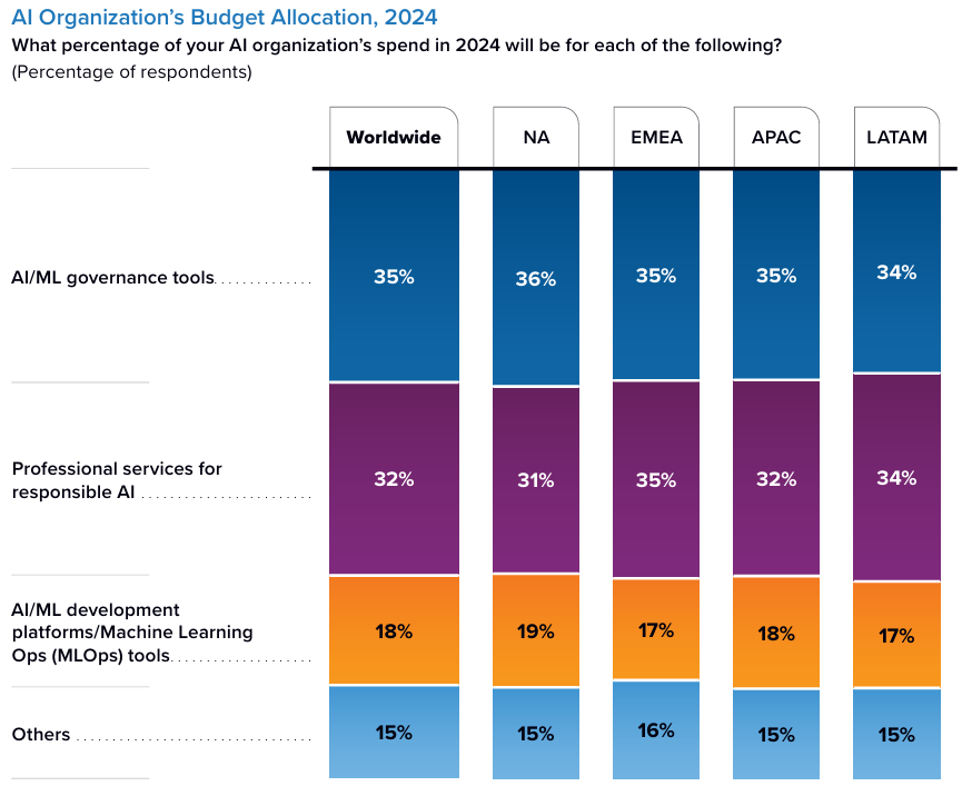各组织正在加大对 AI 技术与机器学习治理工具和专业服务的投资,2024 年有关 AI 领域相关支出中,35% 应用于 AI 技术与机器学习治理工具,32%应用于专业服务。