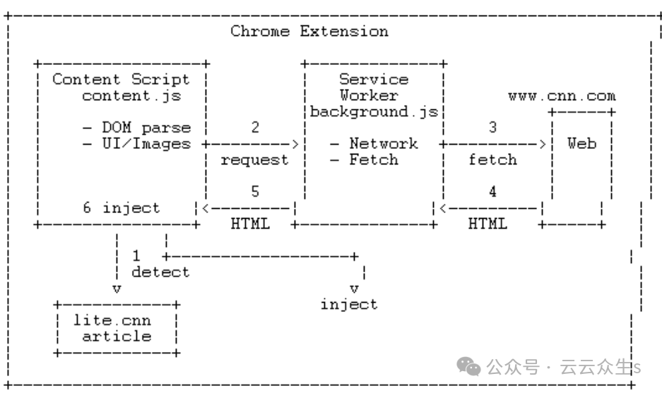 在我之前的文章中,关于ChatGPT 和 Claude 可以看到你屏幕上的什么内容以及开发者如何利用它,我提到过一个浏览器扩展,它使用从完整 CNN 网站获取的图像来增强纯文本的lite.cnn.com。它运行良好,但是使用了已弃用的Manifest V2。当我让 Claude 将其更新到 V3 时,我想要绘制一些架构更改图。因此,在这篇文章中,我将回顾一下这个绘图过程。