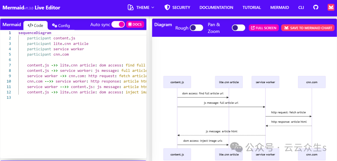 该图表很好地显示了扩展各个部分之间的数据流,但它没有表示内容脚本中发生的处理步骤:从服务工作者获取的完整文章页面的 HTML 中解析图像 URL,并将它们注入到 lite.cnn.com 页面中。Claude 提供了一些想法:使用“Note over”声明在图表上放置注释,或使用“自消息传递”(来自同一参与者的消息)。我说:“让我们两种方法都试试”。Claude 满足了我的要求,之后我选择了自消息传递。后来,当我阅读 Mermaid 文档时,我意识到这个短语不是 Mermaid 官方术语的一部分。它隐含在序列图的参考页面中。