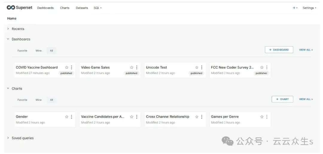 登录后,您将进入此主屏幕,您可以在其中创建仪表板、图表和数据集。第一步是创建一个数据集,我们为可视化提供表或视图。