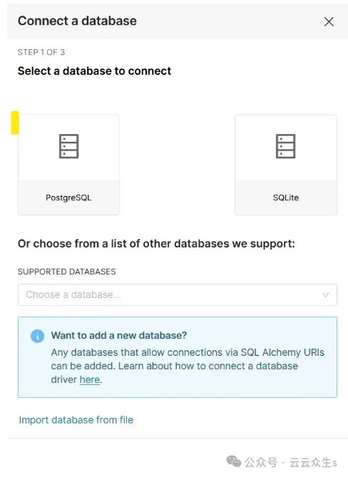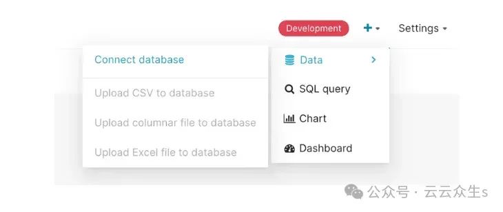 选择右上角的**+按钮,然后选择数据 → 连接数据库**。