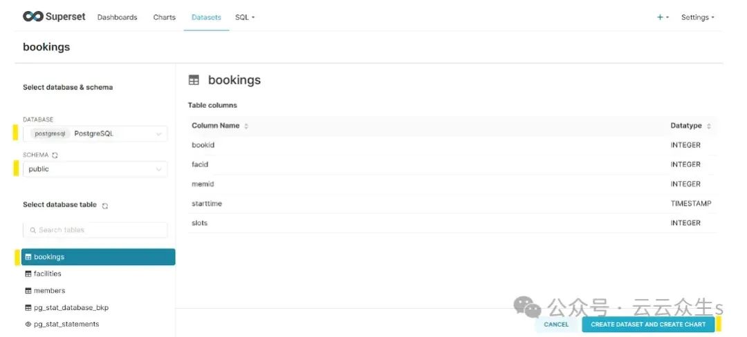 这将带您进入以下屏幕,您可以在其中选择用于可视化的对象。我们使用booking表进行可视化。选择后,选择创建数据集和创建图表按钮。