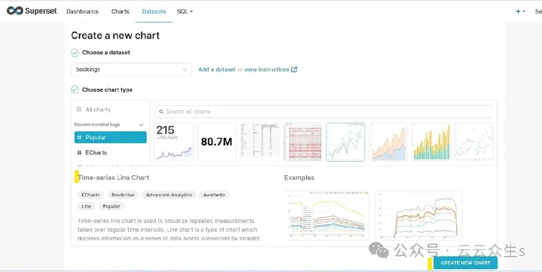 现在,您可以根据数据点选择任何所需的图表。我们将根据我们的要求选择时间序列折线图。选择创建新图表按钮。