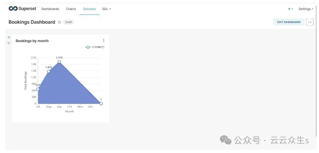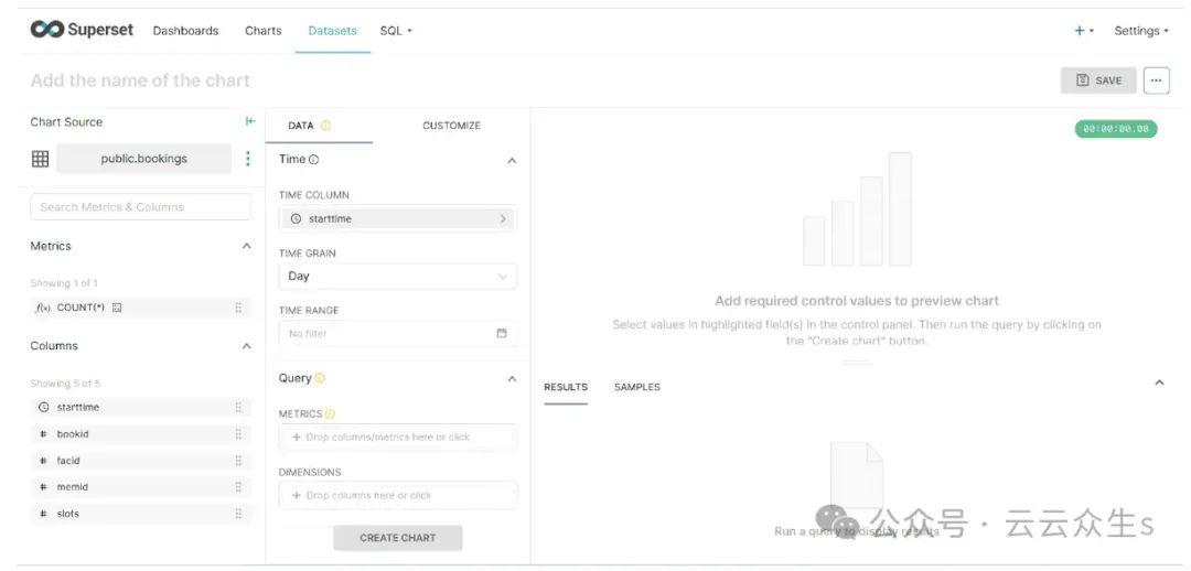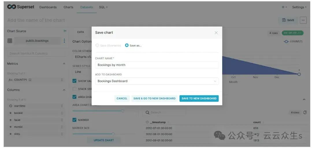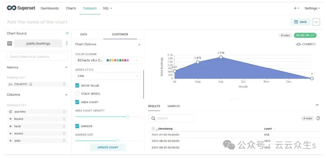 select date_trunc('month', starttime) as month, count(*) from bookings group by month;为此,我们可以在Superset上设置以下参数: