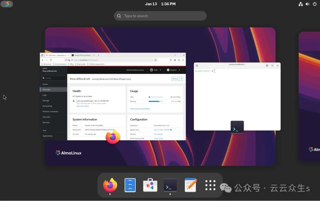 对于那些喜欢带有 GUI 的服务器的用户,AlmaLinux 附带 GNOME 47.alpha,并且仅包含最少的用户界面应用程序(Firefox、GNOME Software、GNOME 文本编辑器、计算器、Tour、相机、时钟、系统监视器、设置、GNOME 终端、磁盘、图像查看器、字体管理器,但仅此而已。你找不到通常的 GNOME 应用程序,例如天气和地图,你也不会在应用程序概述中找到任何媒体播放器。 记住,这是一个服务器操作系统,所以这并不奇怪。