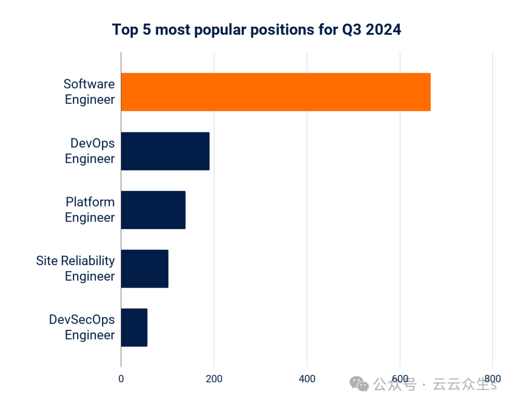 其中,软件工程师职位最受欢迎,其次是 DevOps 和平台工程师职位。在已发布的职位总数中: