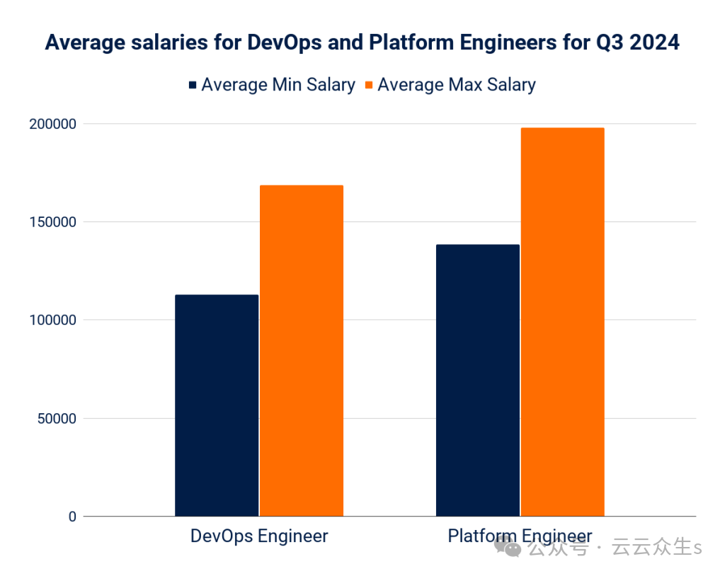 平台工程师的最低薪资比 DevOps 高 18%,最高薪资比 DevOps 高 14%。