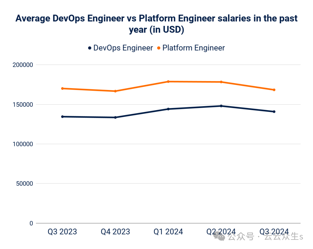 事实上,差异最大的是在 2023 年第三季度,当时平台工程师的薪资比 DevOps 工程师高出 26%。