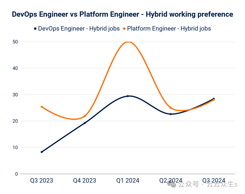 DevOps 和平台工程师职位的混合办公偏好都在逐季度上升。