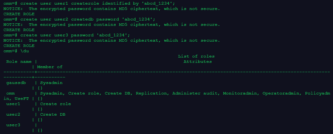 1.创建用户user1、user2和user3,user1具有CREATEROLE权限,user2具有CREATEDB权限,要求使用两种不同的方法设置密码