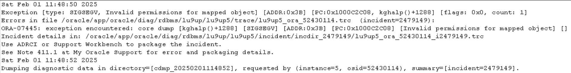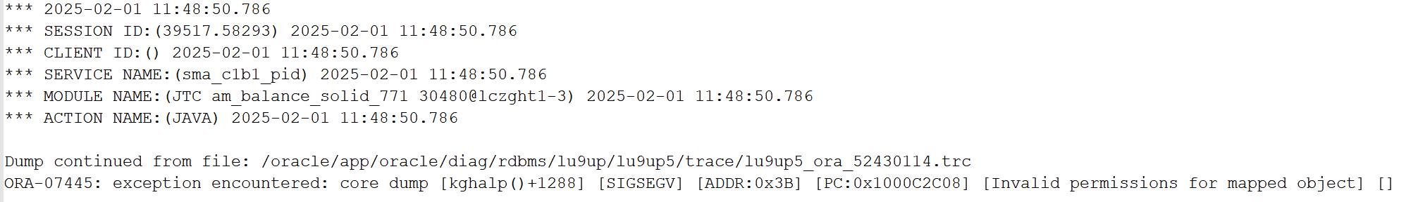 比较有迷惑性的是,因为应用给的程序报错截图没有返回ORA相关错误,一开始以为不是数据库层面的原因,但出于谨慎还是查了alert日志,发现对应时间点有ORA-07445错误: