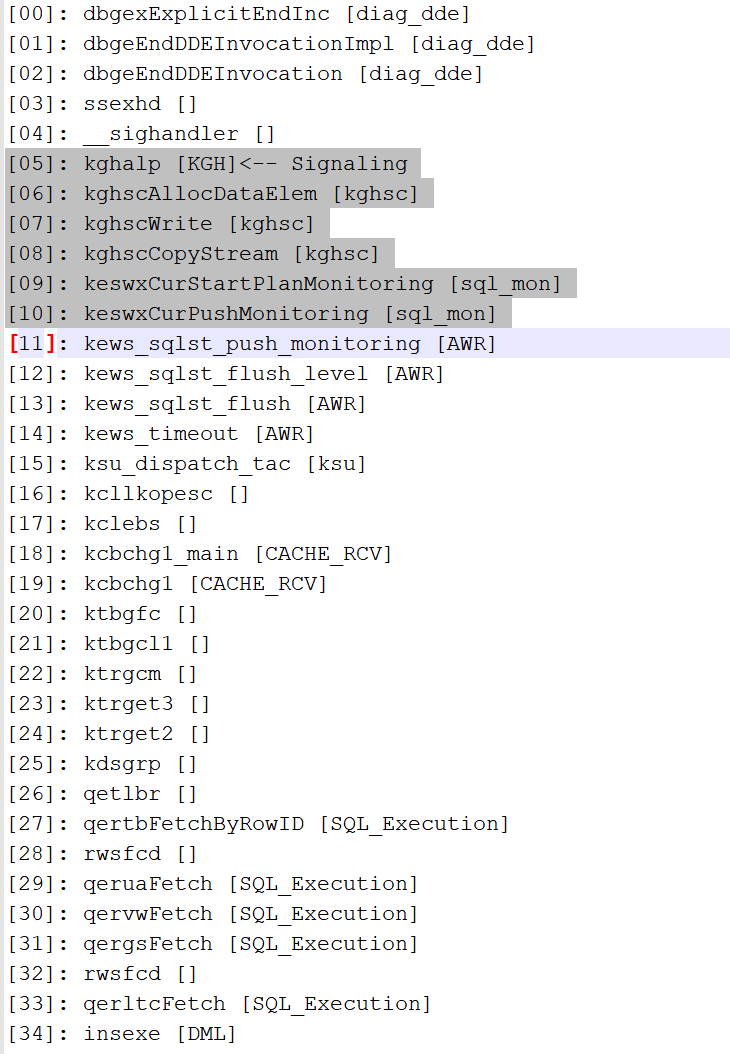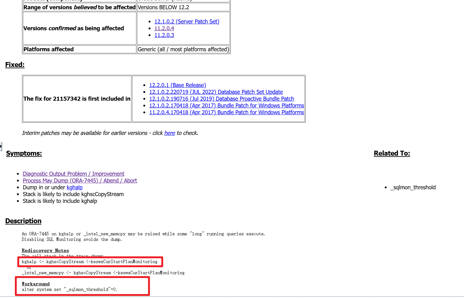 在官网找到相关问题解释,此问题应该是由于 Bug 21157342 - dump on kghalp/_intel_new_memcpy with SQL Monitoring enabled (default):