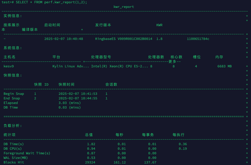 -- test=# SELECT * FROM perf.kwr_report(1,9, 'text','kingbase');