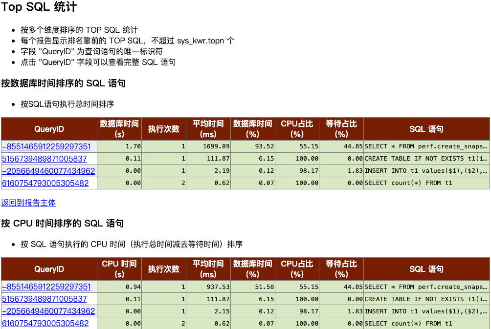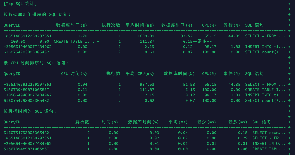 - 通过 query ID 将 SQL 执行时间、等待时间和资源消耗关联起来,进行语句级分析。