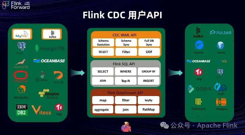 从3.0版本开始,用户现在可以使用三种 API 来编写作业:CDC YAML API、Flink SQL API 和 Flink DataStream API。这三种 API 各有特点,适用于不同的场景,CDC YAML API 是目前最被推荐的选择。- CDC YAML API : 特别适合那些希望以更直观且易于维护的方式定义其数据处理逻辑的用户。它支持多种高级特性,如自动化的 Schema Evolution(表结构变更)、分库分表同步、行过滤、列投影转换(Transform)等。通过 YAML API 实现这些功能不仅简单直接,而且能够极大简化开发流程。对于需要频繁调整表结构或执行复杂的数据迁移任务来说,YAML API 提供了极大的便利性。
