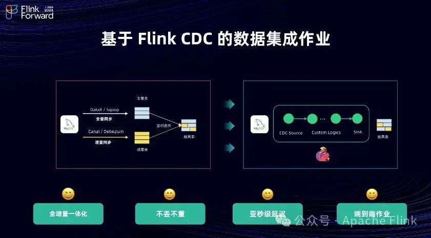 在讨论 Flink CDC 的优势之前,我们先回顾一下传统 CDC(变更数据捕获)的数据集成方案。尽管这种架构较为传统,但目前仍被众多企业所采用。这类做法是将全量数据同步和增量数据同步分开处理:全量同步基于 DataX 或 Sqoop 完成,而增量同步则使用 Debezium 或 Canal 等组件来实现。系统中会同时存在两张表——一个用于存储全量数据,另一个用于存放增量更新的信息;两表由调度系统定时进行合并,方可得到完整的结果表。这种方法的缺点在于整个流程较长且涉及多个组件,这不仅增加了系统的复杂性,也对维护提出了更高的要求。此外,由于定时任务无法保证事务级别的数据一致性,因此难以确保每次合并后的数据都是符合数据库一致性语义的。此外,上述链路难以满足对高时效性场景的需求。即使是极限配置下的调度策略,其更新频率也很难低于5分钟一次;若试图进一步缩短时间间隔至秒级,则很可能导致链路负荷过高,进而崩溃。1.4 基于 Flink CDC 的数据集成作业