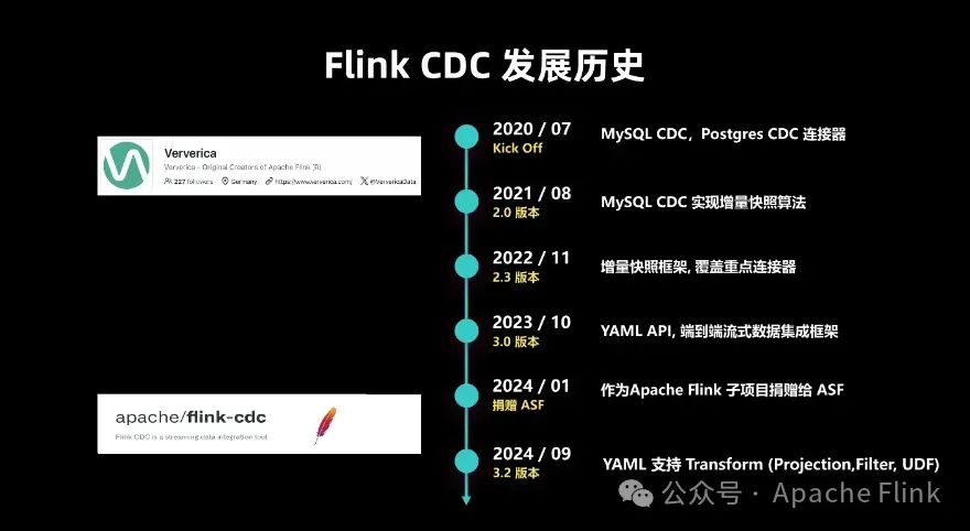 Flink CDC 的架构优势在于其提供了一个端到端的数据流水线(Data Pipeline)。用户仅需编写一个 YAML 文件来定义整个数据流水线的处理逻辑,同时,它还配备了工具支持,使得现有的命令可以直接将 YAML 描述的数据流水线转换为 Flink 作业运行起来。这大大简化了配置和启动流程。在过去的一年里,社区在“细粒度 Schema Evolution”(表结构变更同步)方面做了大量工作。这项功能允许更灵活地应对数据库模式变化的情况,包括但不限于容错机制、容错级别以及进化策略的支持等。这些改进使得 Flink CDC 能够更好地适应不同业务场景下的具体需求。此外,ETL(抽取-转换-加载)过程中的“转换”(Transform)环节对于数据集成至关重要。Flink CDC 在此环节提供了强大的类 SQL 表达能力,支持对部分列进行投影、根据表达式追加计算列、按条件过滤数据行等功能,并且支持表达式嵌套及用户自定义函数(UDF)等。这样的设计极大地提升了基于 Flink CDC 的数据集成任务的效率与灵活性。值得注意的是,Flink CDC 作为早期就致力于实现全增量一体化解决方案的技术之一,不仅能够处理实时变化的数据捕获问题,同时也兼顾了历史数据的批量导入,从而为企业级应用提供了更加全面的数据同步方案。2.1 Flink CDC 发展历史