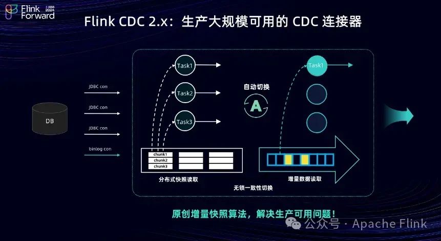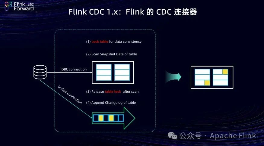 Flink CDC 1.x 系列版本最早于 2020 年发布并开源,它是基于 Flink Source API 实现的一组连接器,可以作为数据源使用,提供了捕获 MySQL 和 PostgreSQL 表中变化数据的能力。然而早期版本实现中,全量捕获转增量捕获的过程需要锁表,由于快照阶段耗时较长,这一过程会对生产业务造成巨大影响,可以认为在生产上基本不可用。(即便如此,当时也积累了一批用户)2.3 Flink CDC 2.x:生产大规模可用的 CDC 连接器