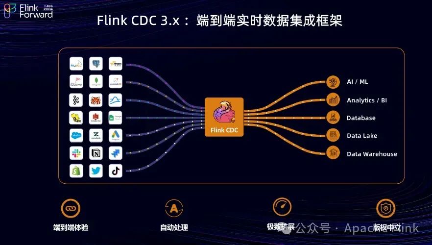 Flink CDC 的 1.x 和 2.x 版本都只是一组支持了 CDC 的 Source 连接器,只能作为 Flink ETL 作业的一部分使用,即从事务型数据库中实时取出数据。这意味着作为一个数据源连接器,只能由用户选择已有的、基于 DataStream 或 SQL API 的 Sink 连接器搭配使用,没有提供完整的、端到端的体验。此外,由于 Flink CDC Source 连接器需要与所有其他符合标准的 Sink 连接器搭配使用,无法简单地加入自定义扩展,因此用户最期望的表结构变更同步、数据库 Binlog 写入 Kafka 等等功能,2.x 都不支持。2.5 Flink CDC 3.x :端到端实时数据集成框架