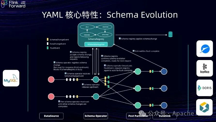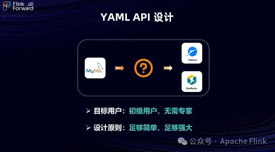 在上述背景下,我们在社区推出了 Flink CDC 3.x 版本,提供了一个面向端到端的实时数据集成框架。它提供完整的数据集成体验,不仅提供了 Source 连接器,还提供了写入外部系统的 Sink 连接器。它能够识别源表的表结构变更,并通过特殊的事件报告给下游;能够正确处理上游动态加表、删除表等事件;此外,很重要的一点是版权归属问题。早期版本的 Flink CDC 在阿里巴巴组织下开源,可能导致社区中立性的疑虑。这些疑虑在捐赠给 Apache 基金会后得到了解决。2.6 YAML API 设计