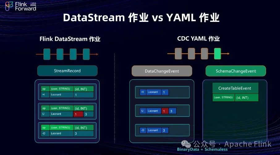 对比一下 DataStream 作业和 YAML 作业,如果一个 Flink DataStream作业,需要用 CDC JSON Format 描述数据结构。这意味着每一条数据记录中,都需要携带对应 Schema 的信息描述。考虑到表结构变更并不常见,大部分数据记录的 Schema 都一样,重复发送给下游的 Schema 就会造成信息冗余、存储空间和 IO 带宽的浪费。而在 YAML CDC 中,数据记录中所有的结构都是经过压缩的 Binary Data,相比 DataStream 的数据记录结构更紧凑,在底层的物理存储上更加节约内存。此外,YAML 作业只在 Schema 发生变化时发送 SchemaChangeEvent 来描述变更信息,即总是使用最新的的 Schema 来描述随后的所有 DataChangeEvent,直到新的 SchemaChangeEvent 出现。这样的设计不用给每条数据记录携带一份 Schema 数据,减少了信息冗余。总结一下 DataStream API 和 YAML API 的区别。DataStream API 主要面向熟悉 Java、Scala 的开发者,且需要对分布式系统有一定理解,才能写出正确且高效的 Flink 作业(包括 Flink 的 DataStream API,持久化 State Backend、Checkpoint 模型等)。此外,为了将 Jar 作业提交到 Flink 上正确执行,还需要了解 Maven 及依赖管理相关的知识。最后,Java 作业其实是比较难以复用的;一个描述 MySQL 写入 Paimon 的 Jar 作业,想要迁移写入 Kafka,很多部分可能都需要从头重写。而 YAML API 就可以比较轻易地应对这些问题。它面向普通用户,不要求高深的前置知识,即可构建强大的整库同步、表结构同步作业。此外,YAML 语法很简单,业界也比较通用,想要复用已有作业就更简单了,因为它只不过是一段文本,只需要对 Source、Sink 的部分属性稍加修改,就能实现写入目标的迁移。2.10 YAML 核心特性:Schema Evolution下面介绍 YAML 的核心特性,第一个是上下游同步的表结构变更(Schema Evolution)。核心原理是在 YAML Pipeline 中传递的事件类型是 Event,既包括描述数据记录变更的 DataChangeEvent,也包括描述表结构变更的 SchemaChangeEvent。在遇到表结构变更事件时,将 Pipeline 里现存的数据全部落盘,然后根据 SchemaChangeEvent 进行表结构的演化,成功后即可继续处理上游数据。目前,上游 MySQL 数据库中可能发生很多 DDL 变化,例如新增表、新增列,修改列类型、重命名列、删表删列等,但在实际业务中,不同类型的结构变更可能有不同的处理需求。例如上游某一列被删除了,下游可能希望保留;部分上游支持的表结构变更,下游可能无法实现。又或者是用户不希望下游表的结构发生改变,不用动业务代码。这样的诉求可以通过 Schema Change Behavior 选项和细粒度配置实现。目前社区推荐使用 LENIENT 和 TRY_EVOLVE 两种模式。LENIENT 是最宽容的模式,能够保证 Schema 的向前兼容性,下游业务方的业务代码不用动。TRY_EVOLVE 会尽量将上游表的变更应用到下游,但相比 EVOLVE 模式略微宽容些,会做一定程度的容错。其他两种模式就比较简单了。EXCEPTION 模式碰到 SchemaChange 就直接抛异常,IGNORE 模式则是忽略所有表结构变更,保证下游 Schema 始终不变。3.1 YAML 核心特性:Transform 设计