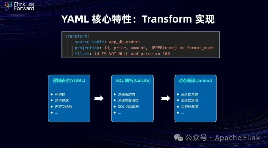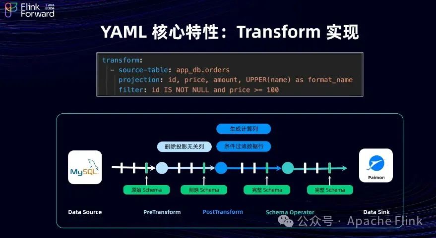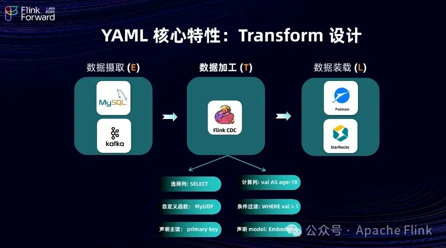 Transform 数据加工过程是 ETL 当中 T 的部分。其中主要的需求包括从表中现存的列里投影出部分列、根据特定表达式的值筛选出特定的数据行、根据已有列计算出新列并加入其中。例如,一个较为复杂的场景可能是这样的:上游存在一个 age 字段,希望追加一个布尔变量 flag,判断 age 是否大于 18,并且只保留 age 和 flag 字段到下游,删除其余数据列。此外,计算列可能涉及到用户定义函数逻辑,甚至调用外部 Web 服务。此外,用户可能还希望根据条件表达式对数据行进行过滤。在合并分库分表写入 Paimon 等数据湖下游时,可能需要手动指定主键列(Primary Key)和分区列(Partition Key)。此外,在结合 AI 场景下是否能支持大模型的调用,这都是 Transform 需要解决的问题。3.2 YAML 核心特性:Transform 实现
