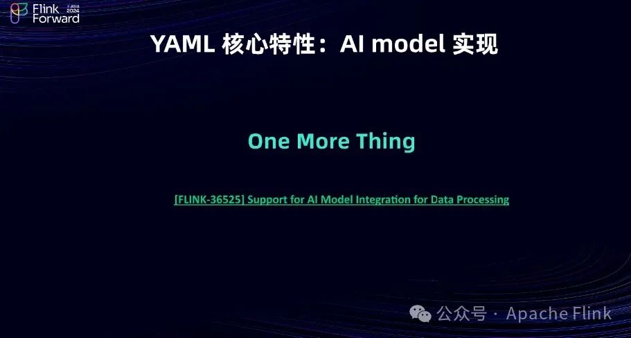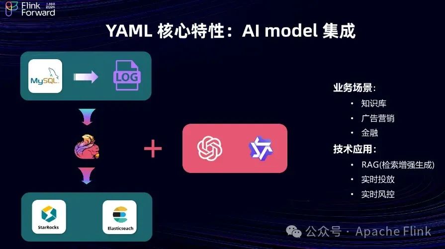 YAML Pipeline 与 AI Model 的深度集成如图所示。左侧是 Flink CDC 从 MySQL 产生的 Binlog 日志中捕获到最新的实时业务数据,并且同步到下游的 StarRocks OLAP 系统或 ElasticSearch 系统构建搜索场景。既然 Transform 已经支持调用任意的 UDF 函数,那能否与 AI 模型集成呢?答案是可以的。在知识库或广告营销、金融这类时效性要求比较强的业务场景中,AI 模型的集成是具备实际需求的,例如 RAG、广告的实时投放、金融行业的实时风控等。3.4 YAML 核心特性:AI model 设计