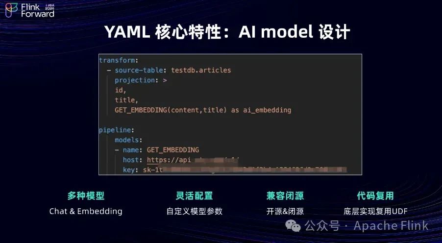 YAML 集成 AI Model 能力的 API 设计如图所示。用户可以在 Pipeline 级别定义 AI Model,目前内置了 Embedding 和 Chat 两类模型。想要调用模型只需要指定 Model 类型、提供一些必要的参数(例如 Host 和 Key 等)即可,生命的模型可以直接在 Transform 表达式中调用。这个例子的场景是从 testdb.articles 表中提取最新发布的文章内容,根据文章的标题及内容生成向量,灌入 ElasticSearch 中,配合整体的 RAG 设计,ElasticSearch 里的向量就代表今天最新的文章的信息,可以用于下游模型的答案生成,实时更新。这是 Flink 实时数据的计算引擎、Flink CDC 实时数据集成框架给 AI 带来的切实收益,通过处理实时数据来帮助模型生成更准确的答案。AI Model API 的设计上能够兼容多种模型,且各个模型的参数可以通过 YAML 自定义配置。同时支持开源和闭源模型,例如 ChatGPT 和阿里的通义千问模型。此外,模型的复用也非常简单,只需复制粘贴模型定义配置项即可。3.5 YAML 核心特性:AI model 实现