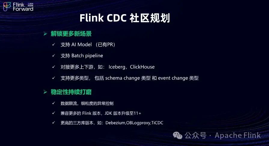 社区规划方面主要分为两部分。第一部分,我们希望解锁更多新的场景,例如 AI Model 的深度集成(笔者注:春节前发布的 Flink CDC 3.3.0 版本已经支持该特性),支持 Batch Pipeline、流批一体等;对接更多的上下游,例如支持 Apache Iceberg,之后会由货拉拉和天翼云的老师一起推动。此外还有支持更多 Schema Change 类型,例如 MySQL 的 Schema 类型总共大概有三十几种,目前应该只支持十几种,许多罕见的类型也希望能够完整支持,保证在线上极端的 Schema 变更的 Case 都能覆盖到。另一部分是关于稳定性的打磨,包括数据限流,细粒度的异常工程。这里的稳定性指的不是 Flink 框架不稳定或者 CDC 框架不稳定,主要是因为 Pipeline 作业和上下游息息相关,上游 DB 负载高, CPU 高或者下游的 Kafka 写的时候压力太大都会导致 Pipeline 不稳定,但是它的根因并不一定在框架,但框架提供的容错支持能够极大地改善用户体验。围绕这部分的工作包括数据限流、兼容更多的 Flink 版本,依赖库版本升级等等。4.3 欢迎加入开源社区
