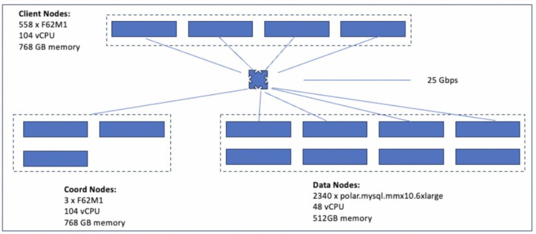 数据库处理能力的增强,有垂直扩展和水平扩展两种方式,垂直扩展主要靠提升硬件能力,水平扩展主要靠增加节点数量。当然,在水平扩展的同时,如果单体硬件的能力获得提升,同样可以提高性能表现。在上表中,PolarDB所使用的CPU主频有所提升,使用的是 Intel Xeon 3.20GHz主频的处理器,较腾讯TDSQL和OceanBase使用 2.5GHz主频的CPU有较大提升。在整体数据中,我关心的核心数据是:每数据节点实现的tpmC。因为只要单节点实现的 tpmC更高,就能够用更少的节点构建满足特定总吞吐量的集群。这有助于整体数据库环境的简化。当下,能耗和空间占用已经成为数据中心的主要矛盾之一。在4个记录中,OceanBase每节点实现了45.5万 tpmC,TDSQL每节点实现了49万tpmC,而PolarDB则将这一数字提升到88万。这是 PolarDB 最大的核心提升表现。虽然不同厂商的数据节点硬件配置有所不同,但是考虑到这是自选的最佳配置,可以以单节点的平均 tpmC作为一个参考指标。PolarDB的整体打榜架构如下图,共使用了558个客户端节点,3个协调节点,2340个数据节点。每个数据节点使用了48 vCPU 和 512G内存。