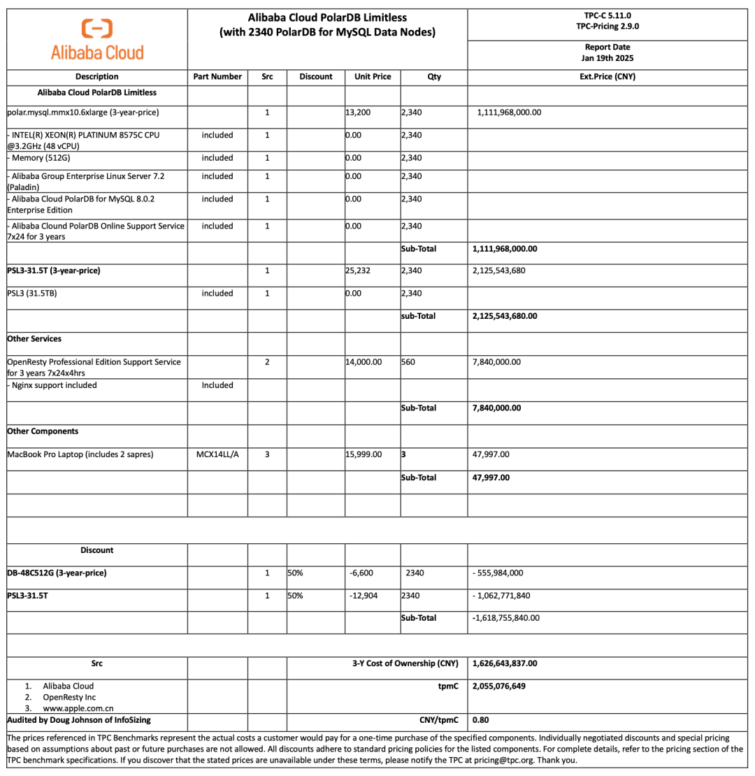 在TPC基准测试中引用的价格代表客户为指定组件一次性购买所支付的实际成本。不允许使用基于过往或未来购买假设而获得的个别协商折扣和特殊定价。所有折扣均需遵循所列组件的标准定价政策。如果您发现所声明的价格在这些条款下无法获得,请通过pricing@tpc.org通知TPC。