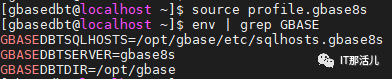 su – gbasedbtvi profile.gbase8sexport GBASEDBTSERVER=gbase8sexport GBASEDBTDIR=/opt/gbaseexport GBASEDBTSQLHOSTS=/opt/gbase/etc/sqlhosts.gbase8sexport ONCONFIG=onconfig.gbase8sexport PATH=/opt/gbase/bin:$PATHexport DB_LOCALE=zh_CN.utf8export CLIENT_LOCALE=zh_CN.utf8unset GL_USEGLUexport PATH=$GBASEDBTDIR/bin:$GBASEDBTDIR/sbin:$PATH[gbasedbt@localhost ~]$ source profile.gbase8s