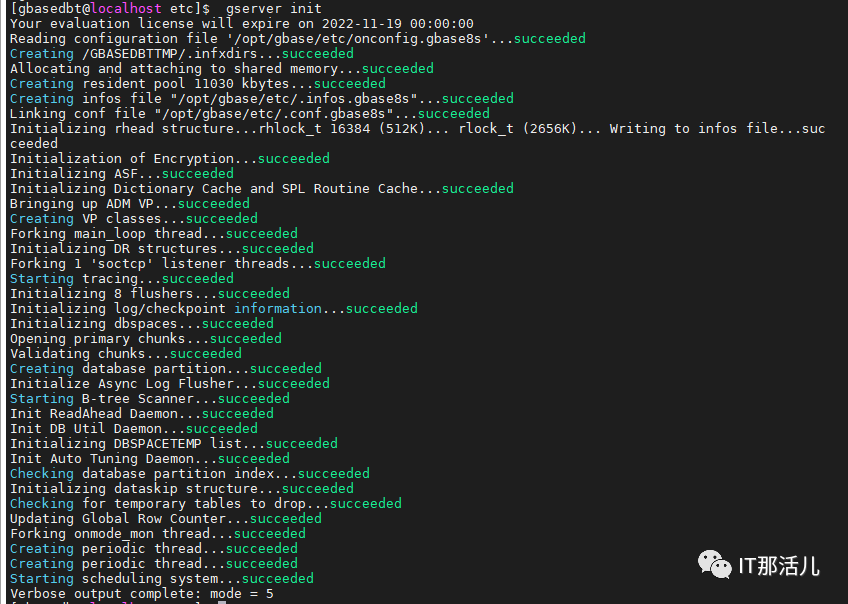 [gbasedbt@localhost ~]$ mkdir -p $GBASEDBTDIR/gbase8s_dbs[gbasedbt@localhost ~]$ touch $GBASEDBTDIR/gbase8s_dbs/rootdbs.dbf[gbasedbt@localhost ~]$ chmod 660 $GBASEDBTDIR/gbase8s_dbs/rootdbs.dbf[gbasedbt@localhost etc]$ gserver init